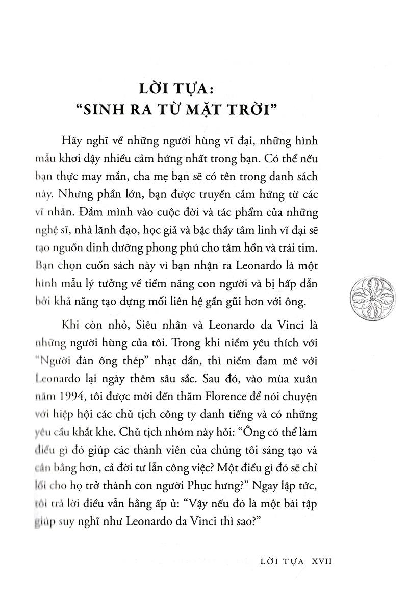 Leonardo da Vinci (1452 - 1519) là một thiên tài toàn năng người Italia: là họa sĩ, kiến trúc sư, nhà điêu khắc, nhà khảo luận mỹ thuật, thiên tài của nền văn hóa và chủ nghĩa nhân đạo thời Phục hưng, xuất chúng trong mọi hình thái nghệ thuật, hơn nữa, còn là nhạc sĩ, nhà toán học kiêm kỹ sư cơ khí, triết gia, bác sĩ, nhà giải phẫu, người đi đầu trong rất nhiều lĩnh vực phát minh khoa học sau này. Leonardo da Vinci là một thiên tài lớn. Ông có năng lực tư duy sáng tạo vô hạn. Tuy nhiên, thiên tài là do học tập chứ không phải tự nhiên mà có. Loài người đã được trao tặng nhiều tiềm năng vô hạn để học tập và sáng tạo. Bạn có thể khám phá khả năng tiềm ẩn của m.ình, mài sắc nó và giải phóng trí thông minh bằng cách thực hiện theo những cách mà thiên tài lớn nhất mọi thời đại Leonardo da Vinci đã làm.