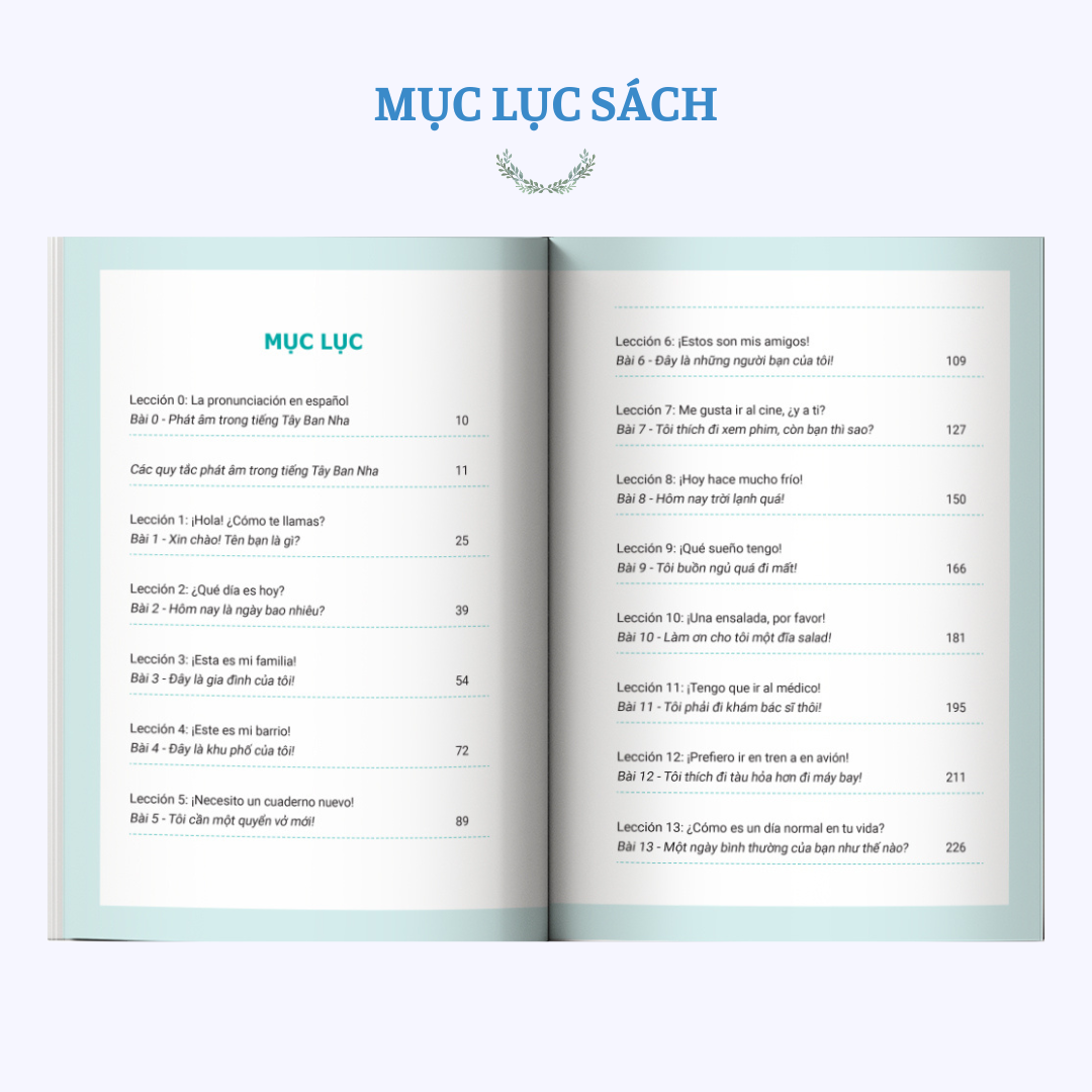 - Lección 1 – 13: Các chủ đề giao tiếp cơ bản như: Xin chào! Tên bạn là gì? Đây là gia đình của tôi! Tôi thích đi xem phim, còn bạn thì sao? Hôm nay trời lạnh quá! Làm ơn cho tôi một đĩa salad! Tôi phải đi khám bác sĩ thôi! Một ngày bình thường của bạn như thế nào? Mỗi bài học bao gồm: từ vựng – mẫu câu – hội thoại – bài tập thực hành để giúp người học dễ nhớ và ứng dụng ngay.