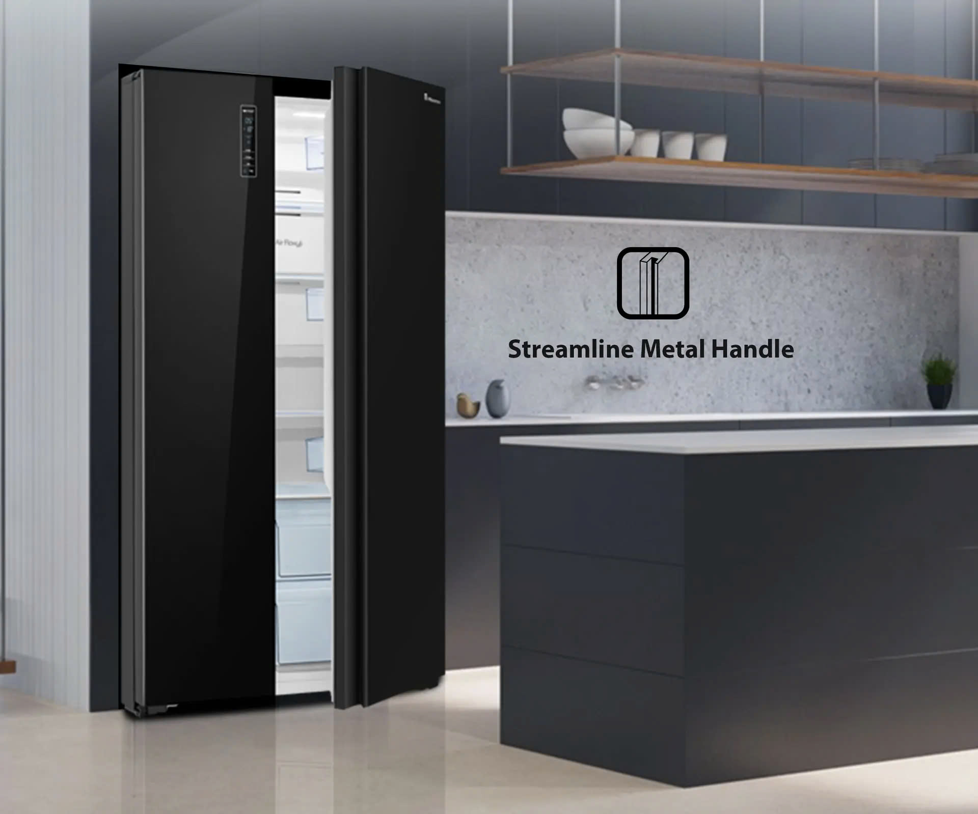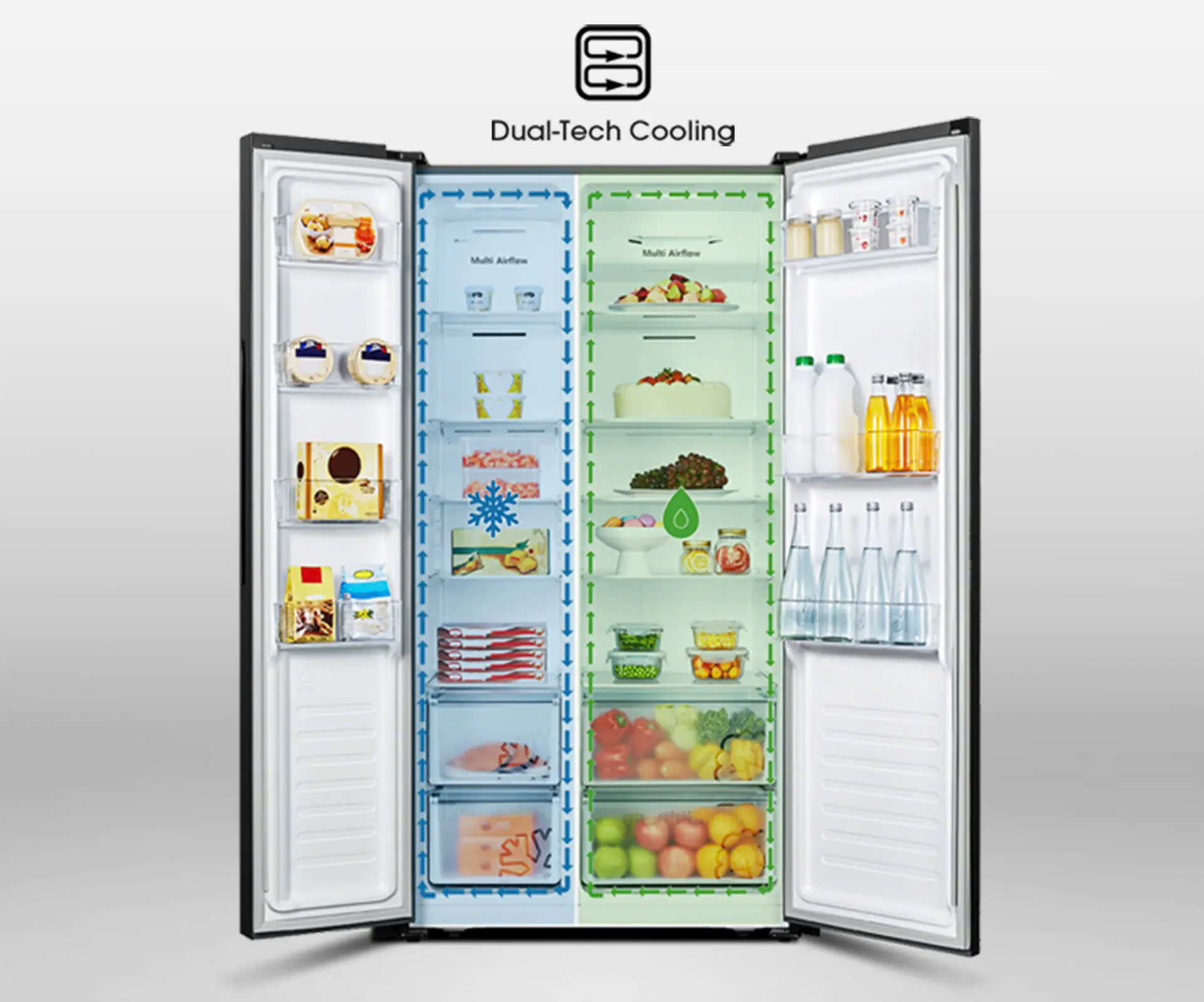 THÔNG TIN SẢN PHẨM - Kiểu tủ:Tủ lớn - Side by Side - 2 cánh - Dung tích sử dụng:519 lít - 4 - 5 người - Dung tích tổng:Hãng không công bố - Dung tích ngăn đá:185 lít - Dung tích ngăn lạnh:334 lít - Chất liệu cửa tủ lạnh:Mặt gương mờ - Chất liệu khay ngăn lạnh:Kính cường lực - Chất liệu ống dẫn gas, dàn lạnh:Ống dẫn gas bằng Đồng - Lá tản nhiệt bằng Nhôm - Năm ra mắt:2023 - Sản xuất tại:Trung Quốc Mức tiêu thụ điện năng - Công suất tiêu thụ công bố theo TCVN:520 kWh/năm - Công nghệ tiết kiệm điện:Inverter Công nghệ bảo quản và làm lạnh - Công nghệ làm lạnh:Luồng khí lạnh đa chiều Multi Air FlowCông nghệ 2 dàn lạnh độc lậpCông nghệ làm lạnh No Frost - Công nghệ bảo quản thực phẩm:Ngăn Moisture Fresh Crisper cân bằng độ ẩm - Công nghệ kháng khuẩn, khử mùi:Bộ lọc Anti Bacteria·Purify diệt khuẩn, khử mùi Tiện ích -
