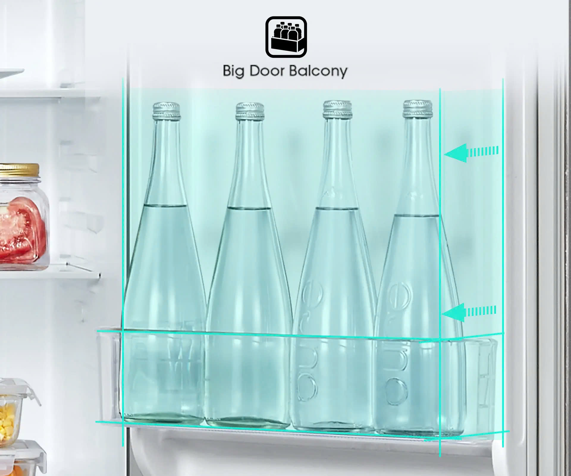 - Khay cửa rộng cho phép bạn dễ dàng đặt những vật phẩm chiếm nhiều diện tích như chai dung tích 2L hoặc 2 lớp lon nước ngọt.