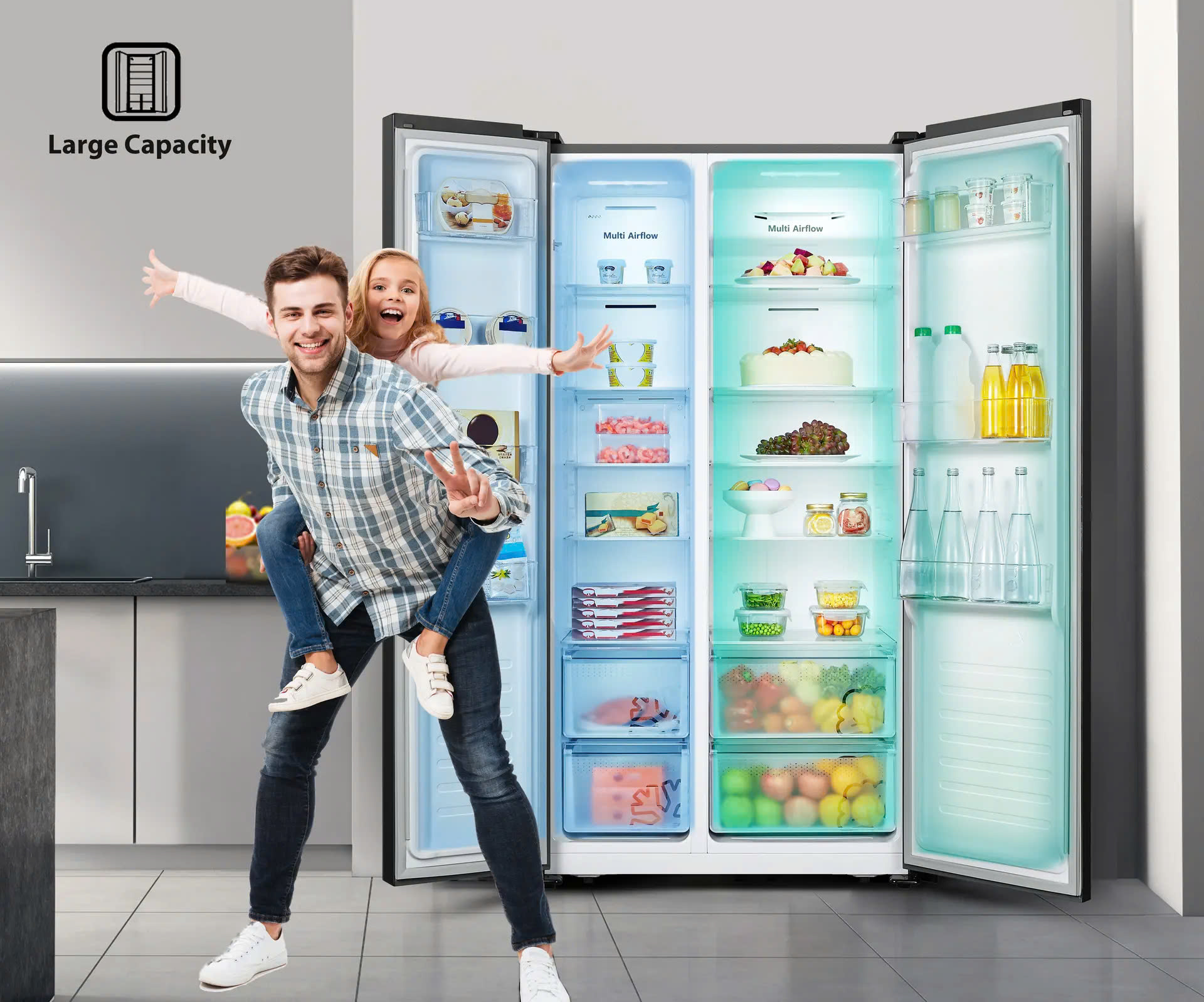 Đặc điểm nổi bật - Tủ lạnh Side by Side 641 lít thích hợp cho gia đình trên 5 thành viên. - Ngăn lấy nước và đá ngoài tiện lợi, tránh mở cửa nhiều lần thất thoát hơi lạnh. - Công nghệ làm lạnh LINEARCooling duy trì nhiệt độ ổn định. - Luồng khí lạnh đa chiều Multi Air Flow đem lại hiệu suất làm lạnh nhanh, đều hơn. - Bộ lọc than hoạt tính khử mùi hiệu quả, giúp không khí trong tủ luôn sạch sẽ. Tổng quan - Kiểu tủ:Tủ lớn - Side by Side - 2 cánh - Dung tích sử dụng:641 lít - Trên 5 người - Dung tích tổng:677 lít - Dung tích ngăn đá:221 lít - Dung tích ngăn lạnh:420 lít - Chất liệu cửa tủ lạnh:Kim loại - Chất liệu khay ngăn lạnh:Kính cường lực - Chất liệu ống dẫn gas, dàn lạnh:Ống dẫn gas bằng Nhôm - Lá tản nhiệt bằng Nhôm - Năm ra mắt:2024 - Sản xuất tại:Trung Quốc Mức tiêu thụ điện năng - Công suất tiêu thụ công bố theo TCVN:624 kWh/năm