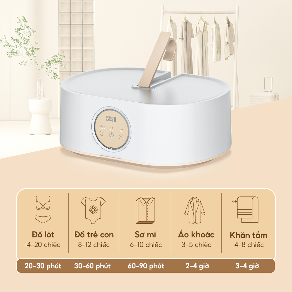 - Máy sấy quần áo Lebenlang thiết kế nhỏ gọn: Với thiết kế nhỏ gọn, tủ sấy LBL6268 tiết kiệm không gian và dễ dàng đặt ở bất kỳ nơi đâu trong nhà.