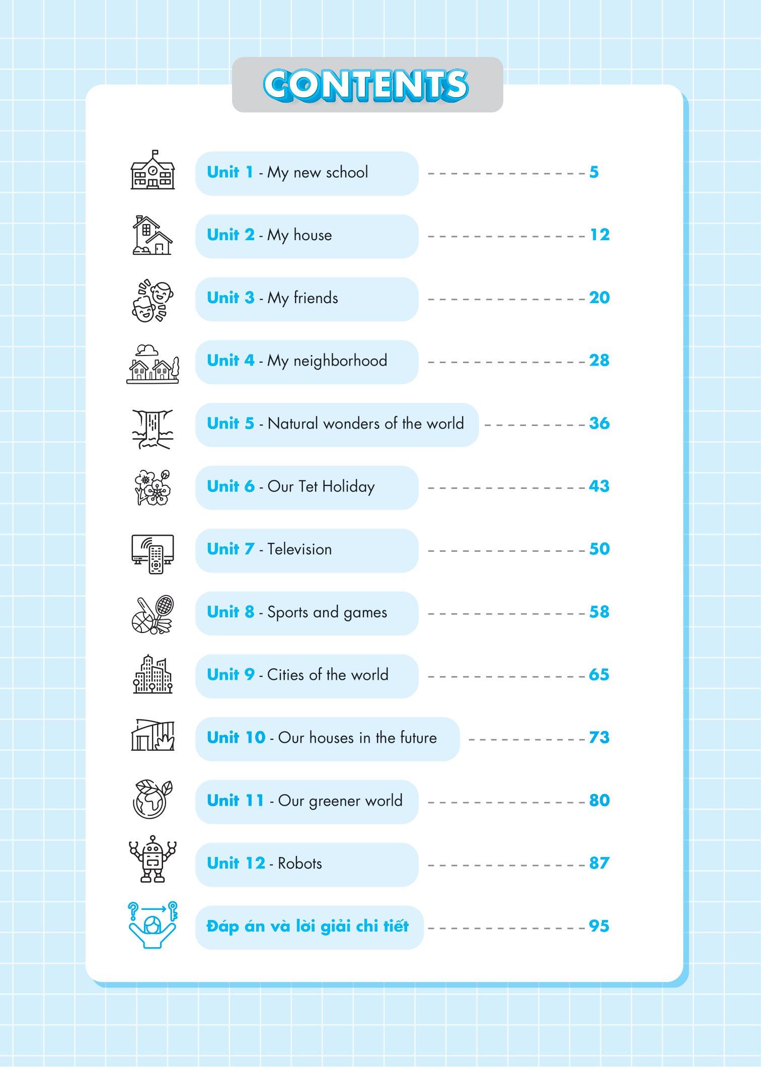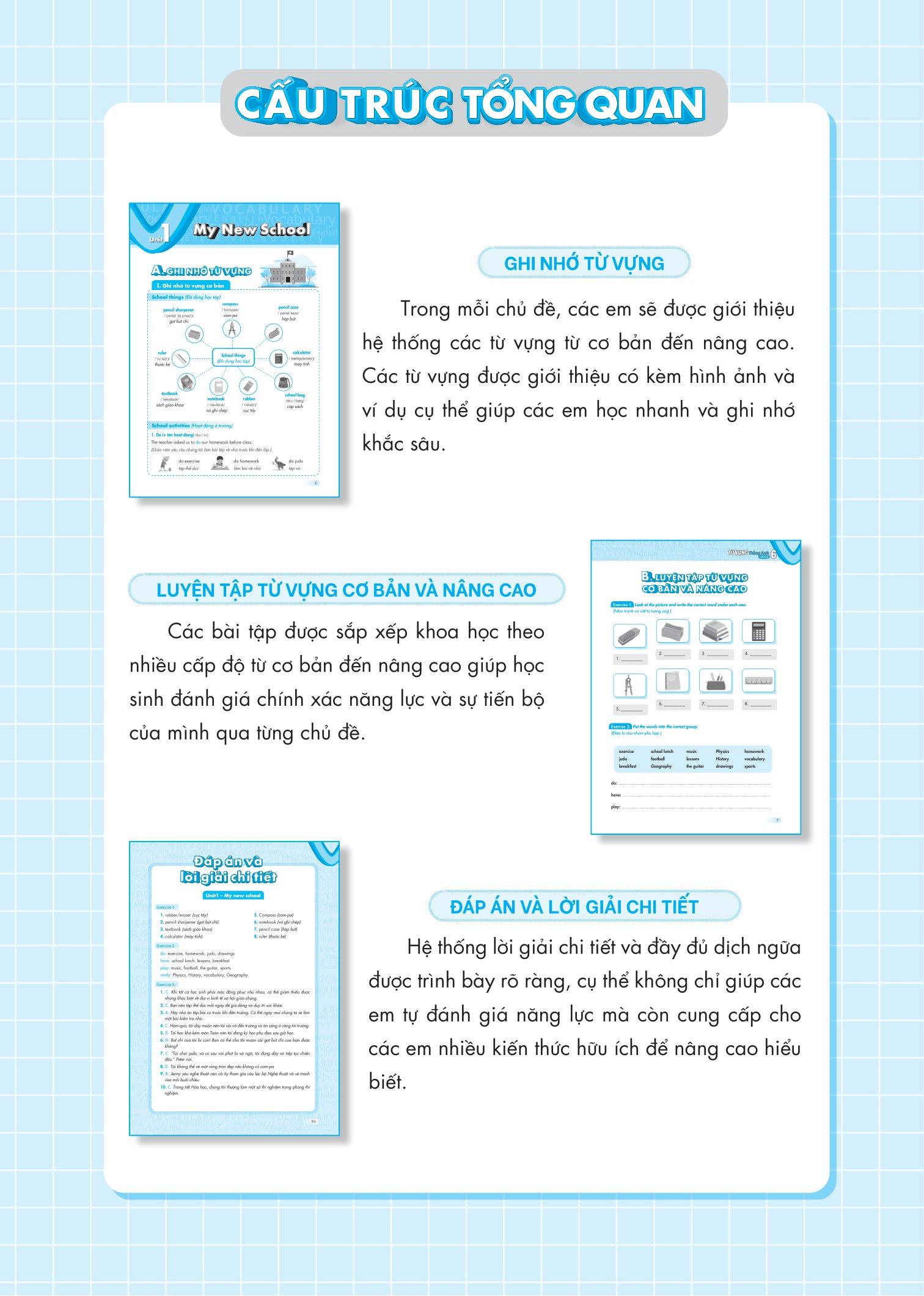 Nội dung kiến thức bám sát theo các chủ đề bài học theo chương trình sách giáo khoa của Bộ giáo dục và Đào tạo, vừa giúp các em củng cố kiến thức cơ bản vừa mở rộng và thực hành kiến thức nâng cao, hỗ trợ quá trình tự học tiếng Anh hiệu quả.