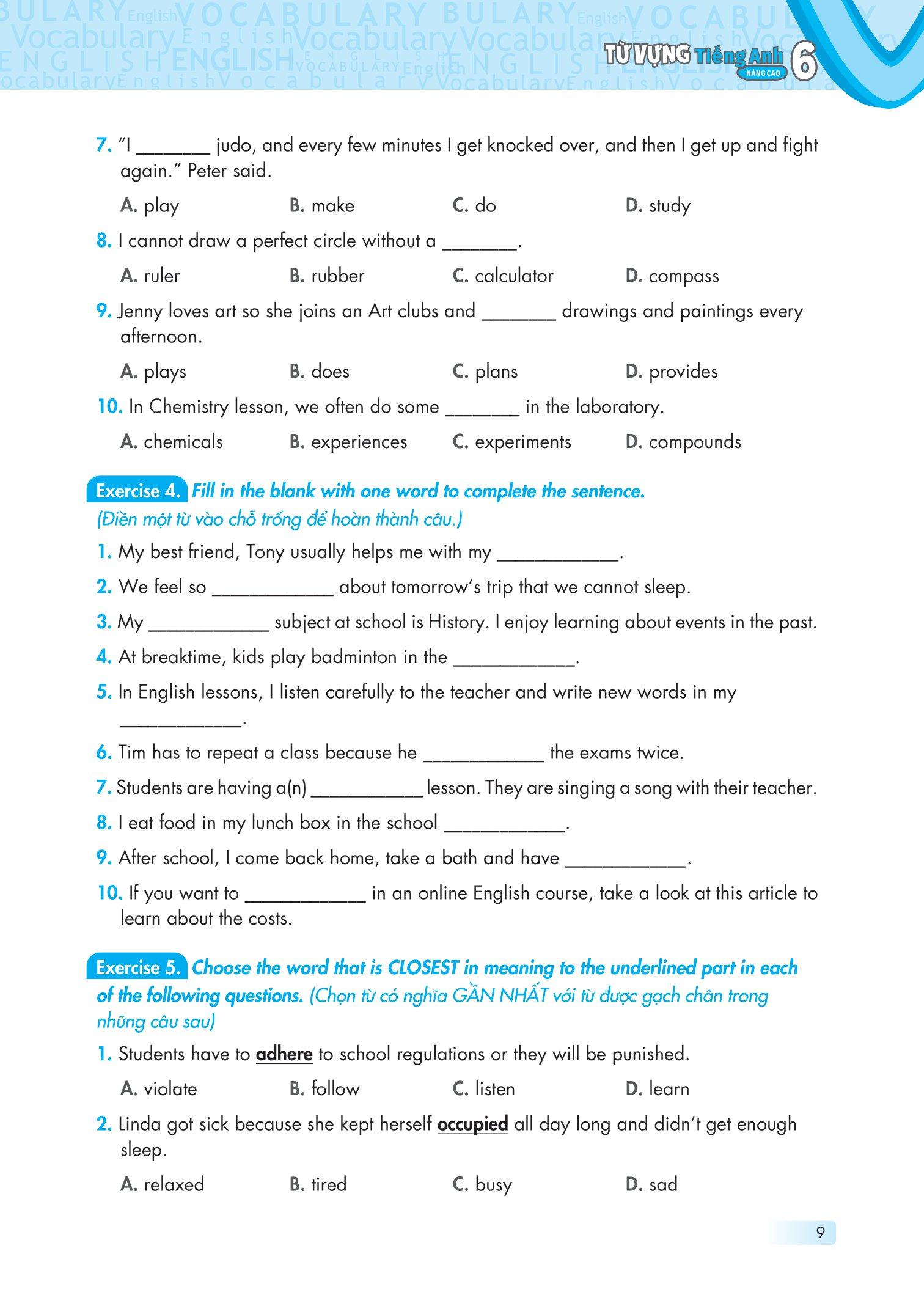 “Từ vựng tiếng Anh nâng cao” bao gồm 4 cuốn từ lớp 6 đến lớp 9. Mỗi cuốn sách được chia làm các chủ đề khác nhau, mỗi chủ đề gồm 2 phần Lý thuyết – Bài tập tương ứng bám sát khung chương trình tiếng Anh cấp Trung học cơ sở của Bộ Giáo dục và Đào tạo. Mỗi chủ đề sẽ giúp các em ôn tập các từ vựng cơ bản và mở rộng thêm vốn từ bằng các từ vựng nâng cao, cùng các bài tập đa dạng với nhiều cấp độ, giúp các em củng cố và rèn luyện thành thục các từ vừa học.