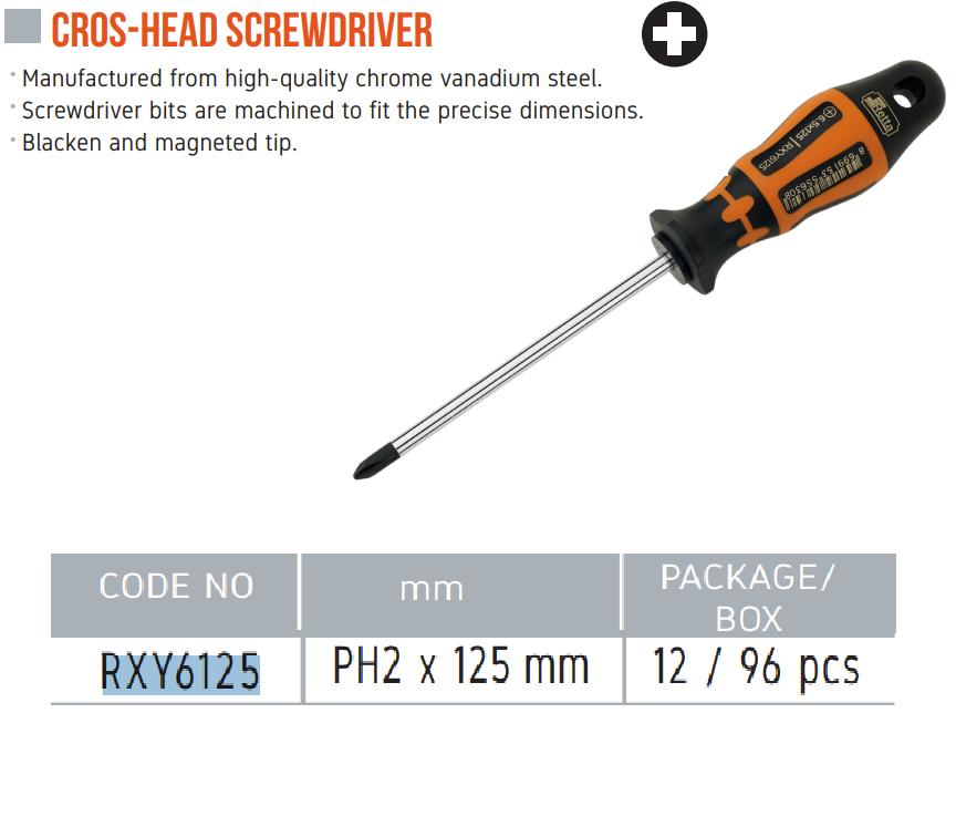 Tua vít 4 cạnh PH2 x 125mm Retta RXY6125 Thổ Nhĩ Kỳ Model:RXY6125 Chiều dài:125mm Là dụng cụ cầm tay, chuyên dùng để vặn, siết đóng ốc vít bằng tay. Sản phẩm được gia công rất tỉ mỉ, đã qua kiểm định nghiêm ngặt, đáp ứng được những yêu cầu về kỹ thuật, chất lượng, đảm bảo sự an toàn cho người dùng