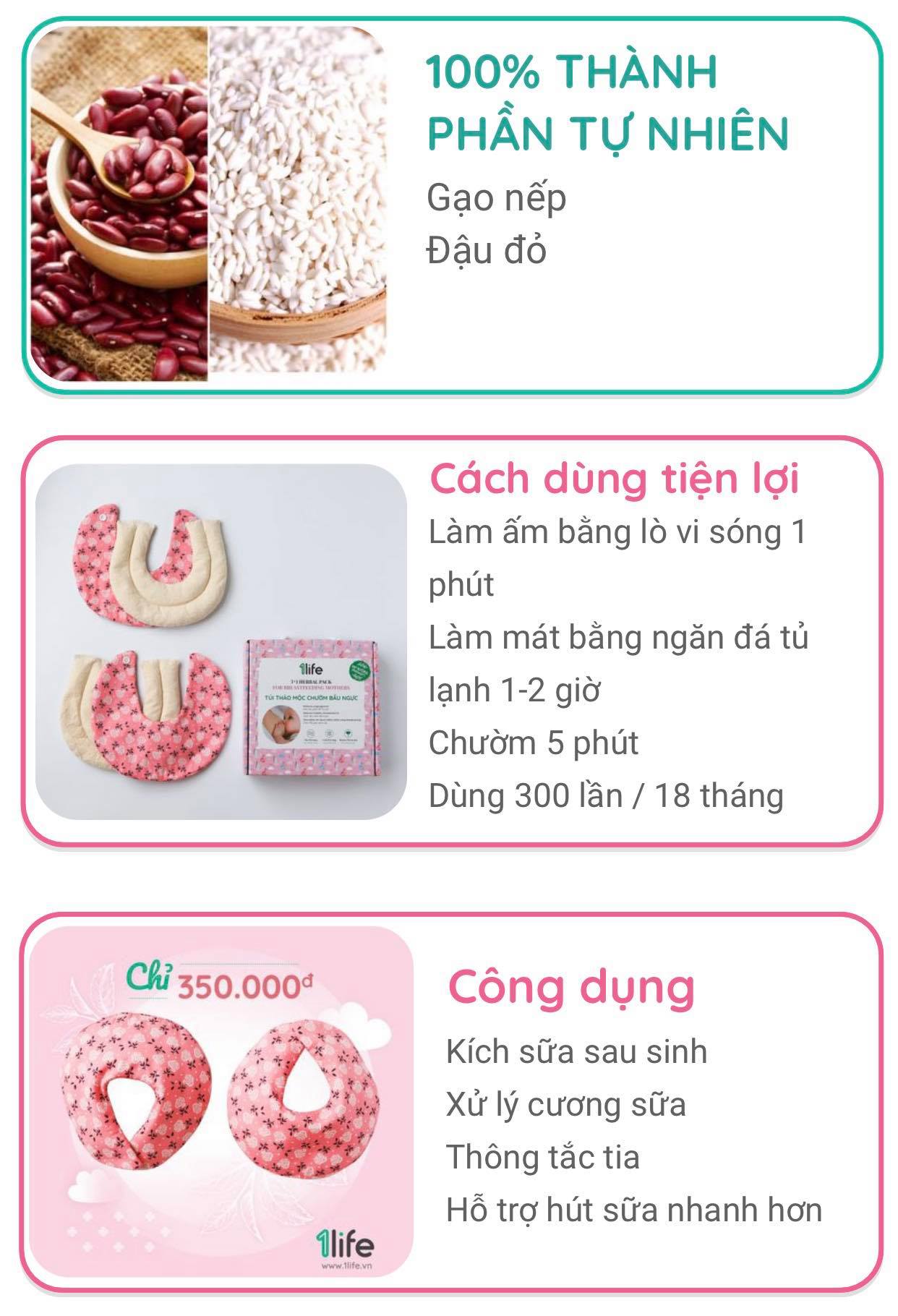 Công dụng: Kích sữa sau sinh Giảm tắc tia sữa Giảm đau, viêm bầu ngực Giảm thời gian bơm sữa 3 cách áp dụng: Liệu pháp nóng: giảm tắc tia, căng cứng, kích sữa xuống nhanh Liệu pháp lạnh: giảm đau buốt , hoặc sau khi cho bé bú Hỗ trợ bơm sữa với máy: có thể sử dụng với máy bơm điện hoặc máy bơm tay, làm kích sữa xuống nhanh, giảm thời gian bơm sữa 100% thành phần tự nhiên: gạo nếp và đậu đỏ