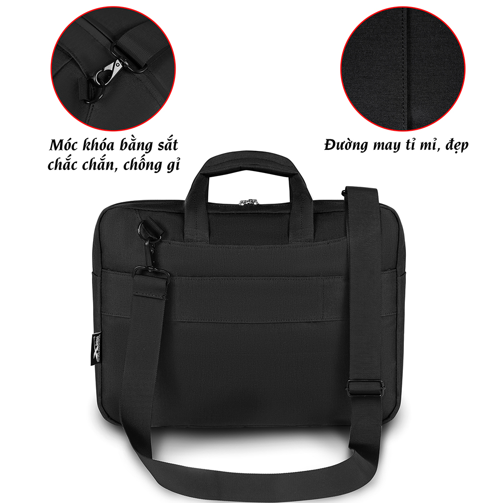Túi đựng laptop Xbags Elengant Màu sắc: Đen Chất liệu : Polyester, EVA, PE Trọng lượng: 0.7kg Kích thước: 39 x 29 x 5 cm Thời hạn bảo hành: 1 năm Mặt trước: Một sản phẩm dành để đựng laptop, phù hợp cho nhiều đối tượng như: công sở, học sinh sinh viên,.. với nhiều ưu điểm nổi trội. Mang trong mình sự hiện đại, với tone màu phù hợp mà không phân biệt tuổi tác. Bên ngoài được sử dụng chất liệu Polyester chống trượt nước, bên trong có thêm lớp đệm dày dặn chống sốc để tránh những va đập cộng hưởng thêm lớp lót bảo vệ túi được chắc chắn mang đến trải nghiệm về chất lượng tốt hơn. Túi đựng laptop có 2 ngăn Bên trong ngăn chính được thiết kế thêm 1 vách ngăn có dây đai cố định chiếc laptop, để tăng khả năng bảo vệ chiếc laptop một cách tối đa nhất. Ngăn phụ bên ngoài có thể để các đồ dùng khác như tài liệu, thẻ, phụ kiện,… Mặt lưng phía sau có thêm dây ngang túi gài vào vali rất tiện khi đi công tác Với thiết kế đầu khoá bằng kim loại cao cấp chắc chắn, chống gỉ cực bền Trọng lượng túi chỉ 500gam, với chiếc túi cực kỳ gọn nhẹ cho những ai yêu thích thì không nên bỏ qua chiếc túi này. Sản phẩm này là tài sản cá nhân được bán bởi Nhà Bán Hàng Cá Nhân và không thuộc