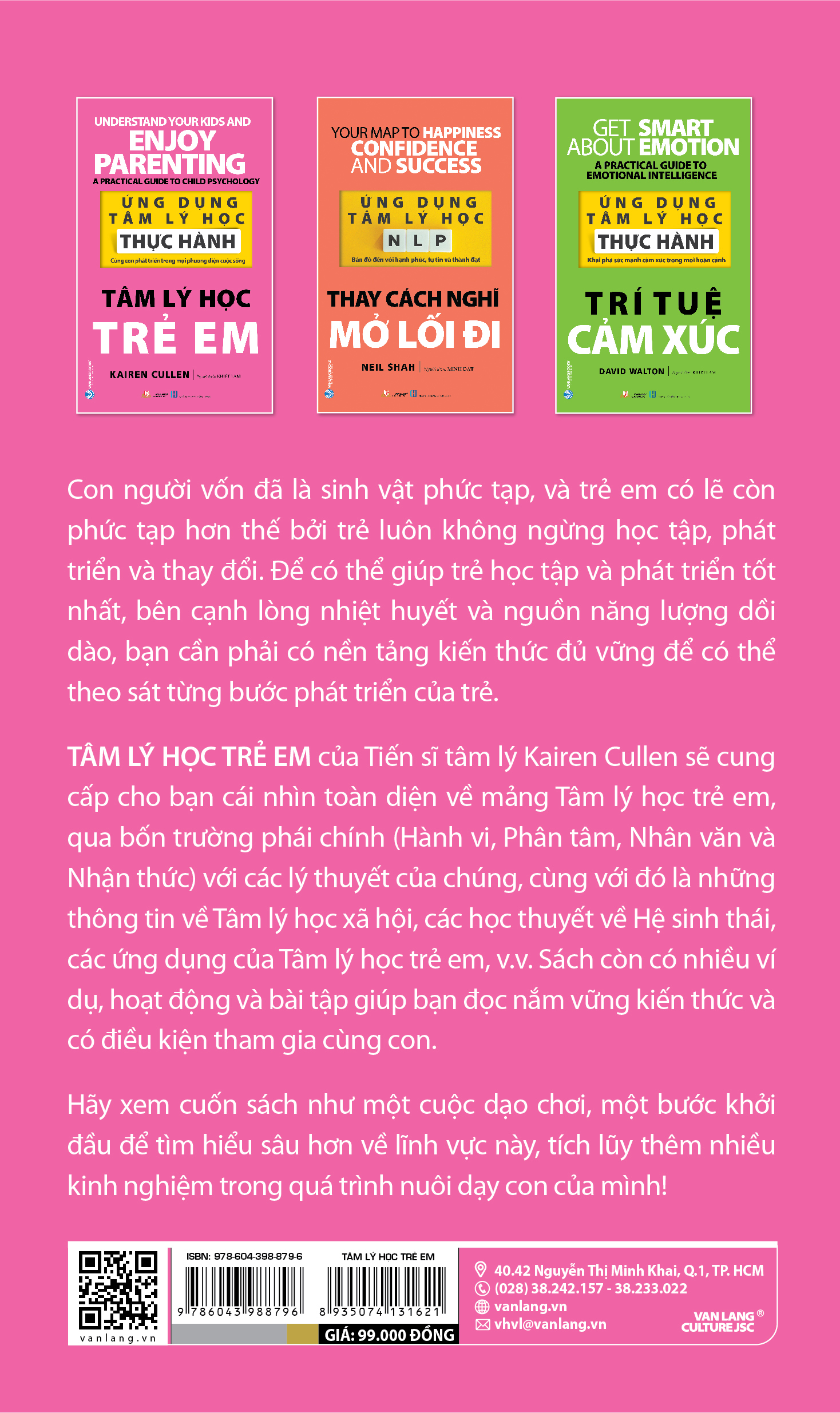 Tâm lý học trẻ em của Tiến sĩ tâm lý Karen Cullen sẽ cung cấp cho bạn cái nhìn toàn diện về mảng Tâm lý học trẻ em, qua bốn trường phái chính (Hành vi, Phân tâm, Nhân văn và Nhận thức) với các lý thuyết của chúng, cùng với đó là những thông tin về Tâm Lý Học Xã Hội, các học thuyết về Hệ sinh thái, các ứng dụng của Tâm lý học trẻ em, Sách còn có nhiều ví dụ, hoạt động và bài tập giúp bạn đọc nắm vững kiến thức và có điều kiện tham gia cùng con.