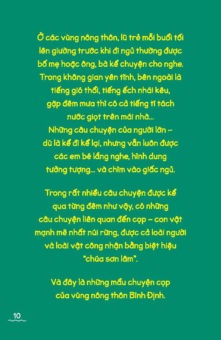 Tập sách kể 5 câu chuyện về Cọp chưa từng ghi lại trên sách vở mà được truyền khẩu đặc biệt trong giới võ thuật Bình Định xưa. Cái hay của những câu chuyện là người thật, việc thật, ở một xứ sở có thật, đủ để hấp dẫn trẻ em khi tự đọc hoặc nghe kể lại.