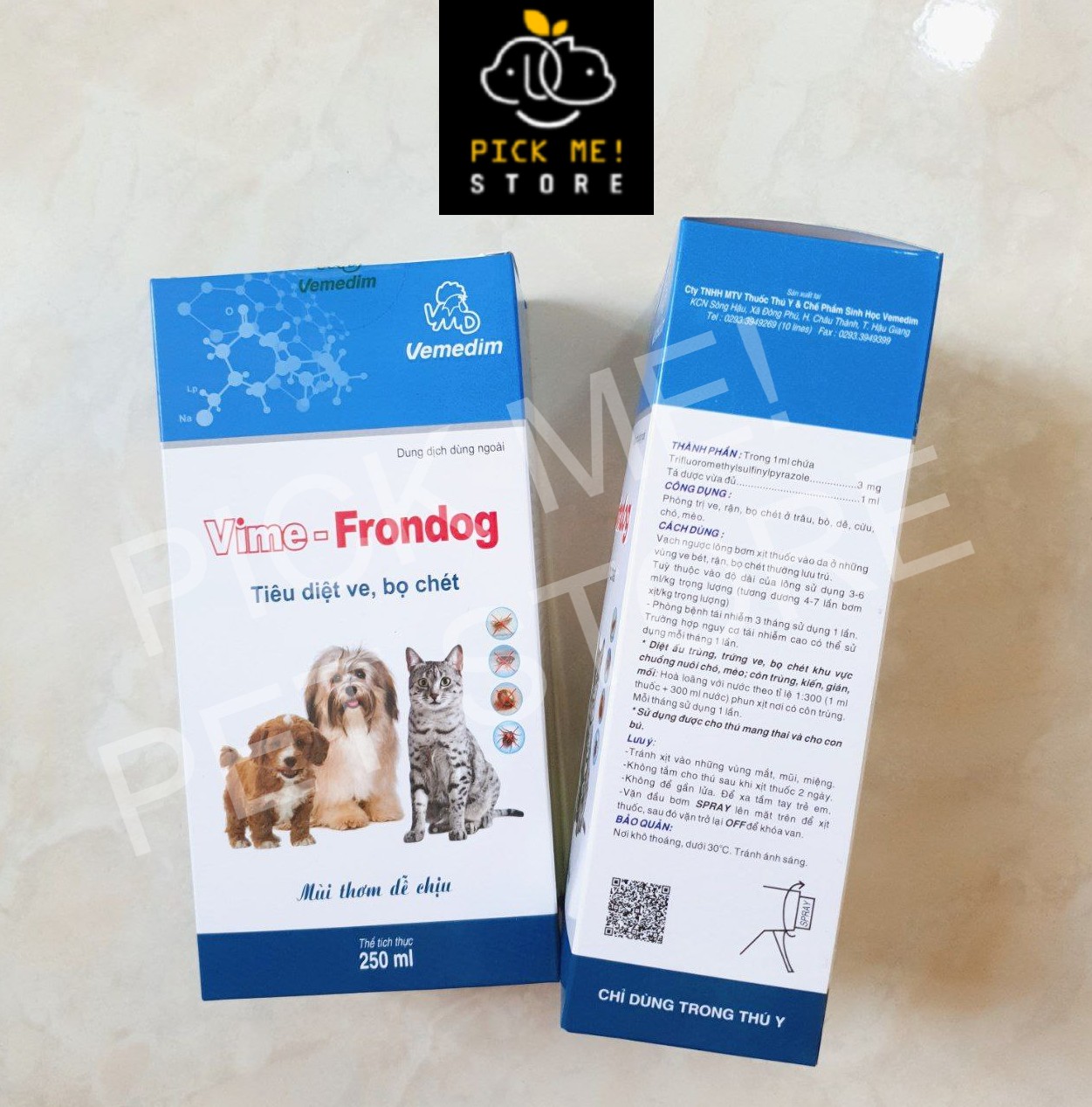 Vemedim Vime - Frondog 250ml | Xịt Ve Rận Bọ Chét Cho Chó Mèo Khử Khuẩn Chuồng Nuôi CÁCH DÙNG Vạch ngược lông, xịt vào da ở những vùng ve, rận, bọ chét thường lưu trú. Tuỳ thuộc vào độ dài của lông sử dụng 3-6 ml/kg trọng lượng (tương đương 4-7 lần bơm xịt/kg trọng lượng). Phòng ngừa 3 tháng sử dụng 1 lần. Trường hợp nguy cơ cao có thể sử dụng mỗi tháng 1 lần. Xử lý ấu trùng, trứng ve, bọ chét khu vực CHUỒNG NUÔI chó, mèo; côn trùng, mối, mọt, kiến, gián: