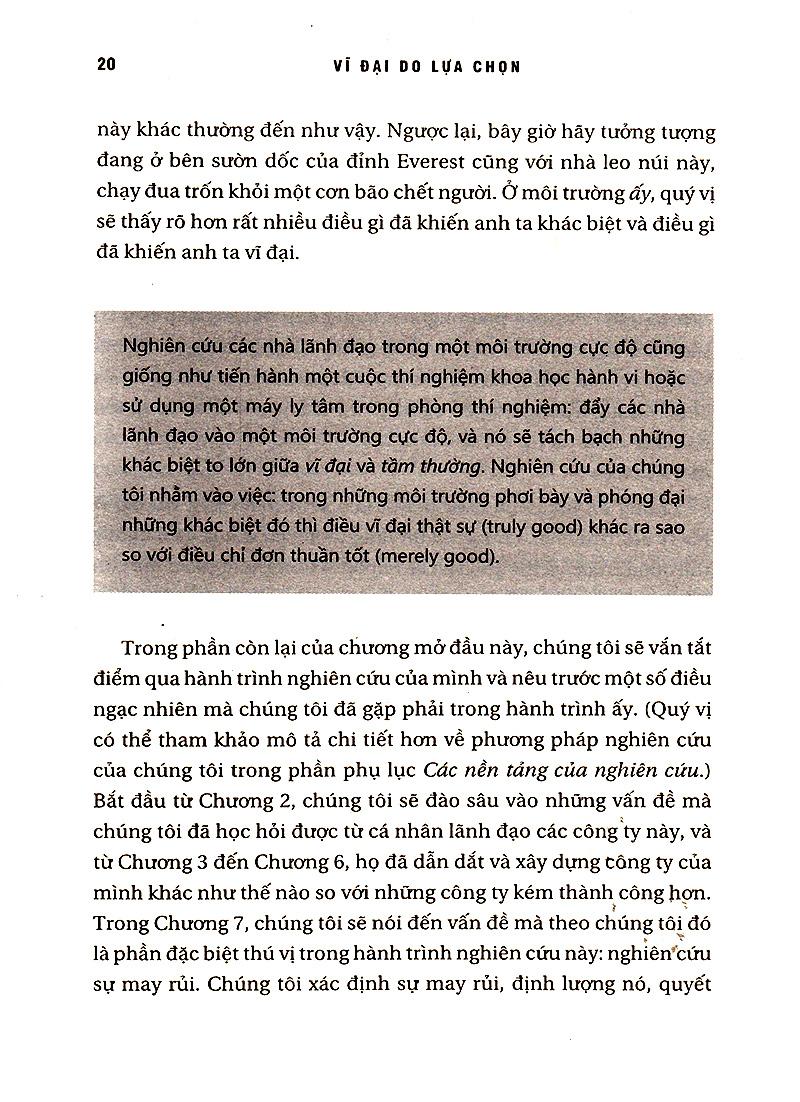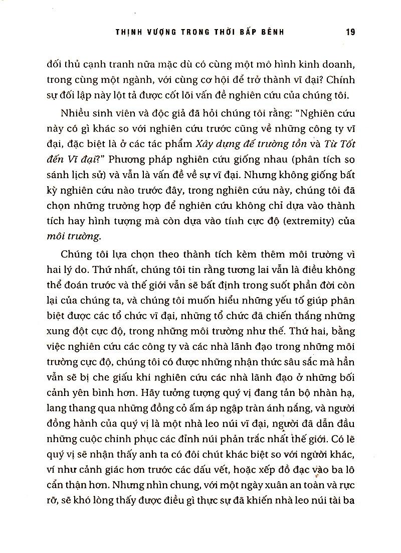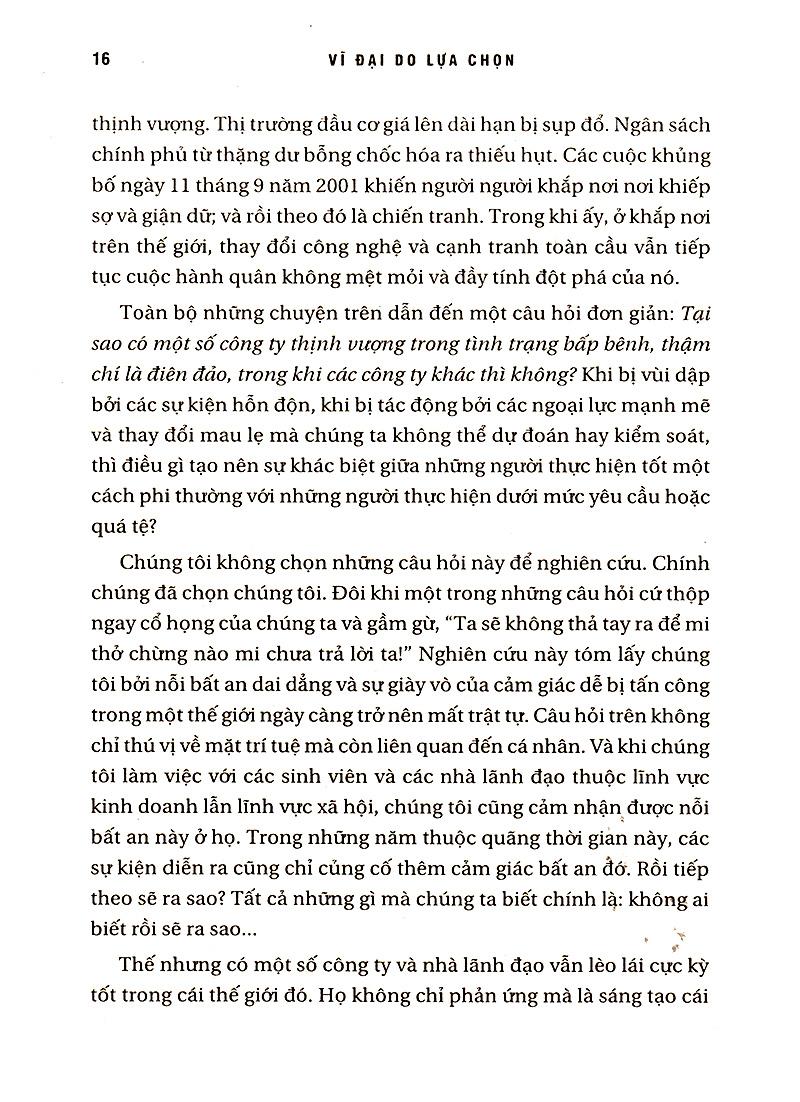 Vĩ Đại Do Lựa Chọn Jim Collins là tác giả của hai đầu sách nổi tiếng - Từ tốt đến vĩ đại và Xây dựng để trường tồn. Cùng với phương pháp nghiên cứu như hai cuốn đầu tiên, trong quyển sách này, Jim Collins cùng với Morten T. Hansen đi tìm câu trả lời cho câu hỏi, tại sao các công ty vĩ đại vẫn trường tồn trong những lúc khó khăn, hỗn loạn. Qua rất nhiều năm nghiên cứu khoa học từ những công ty và các lãnh đạo hàng đầu, hai tác giả rút ra được kết luận rằng: Chúng tôi không tin cuộc sống sẽ trở nên tốt đẹp hơn hay có một phép nhiệm mầu và đoán định được tương lai, nhưng có thể nói nhữg tác động phức tạp, toàn cầu hóa và công nghệ đang thúc đẩy thay đổi và càng dễ bị thay đổi hơn bao giờ hết. Chúng tôi cảm thấy trấn tĩnh vì chúng tôi đã hiểu hơn phải có những gì để sống sót, lèo lái và chiến thắng. Theo chúng tôi, trường tồn và tiêu vong phụ thuộc vào những hành động của chúng ta hơn là những gì mà thế giới gây cho chúng ta; và sự vĩ đại không chỉ là một cuộc chinh phục về kinh doanh, nó là cuộc chinh phục của con người. Và kết quả nghiên cứu sẽ gây bất ngờ cho nhiều nhà lãnh đạo các tổ chức đọc quyển sách này: Những nhà lãnh đạo của các công ty vĩ đại không sáng tạo hơn, không có tầm nhìn xa hơn, không có cá tính hơn, không có vận may hơn, không thích tìm kiếm rủi ro hơn, không anh hùng hơn, và không có khuynh hướng thực hiện những nước cờ lớn, táo bạo hơn. Nhưng họ đã lèo lái được công ty họ qua những lúc khó khăn để luôn trường tồn, bởi vì họ sống và làm việc theo ba yếu tố cân bằng nhau: kiên định với nguyên tắc, sáng tạo theo kinh nghiệm và biết sợ hãi một cách hữu ích. Quyển sách phù hợp với tầng lớp doanh nhân và lãnh đạo các công ty Việt Nam, những người nghiên cứu về kinh doanh, đang trong quá trình lèo lái con thuyền công ty vươn lên sau khủng hoảng và hướng tới vĩ đại vĩnh cửu.