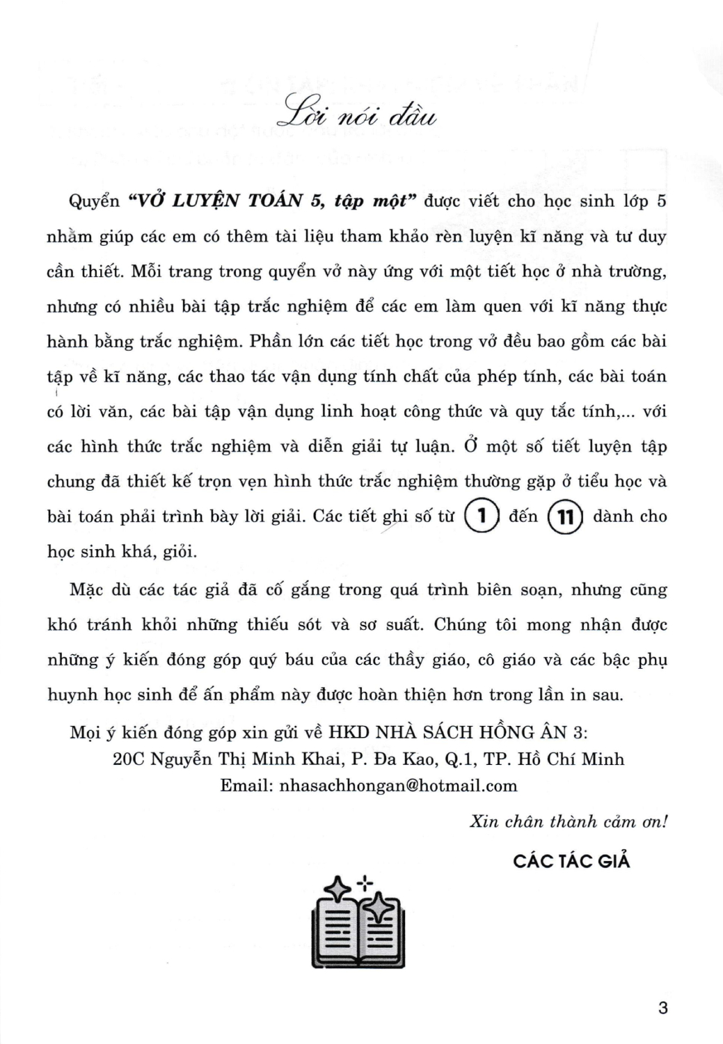 Quyển Vở Luyện Toán 5 được viết cho học sinh lớp 5 nhằm giúp các em có thêm tài liệu tham khảo rèn luyện kĩ năng và tư duy cần thiết. Mỗi trang trong quyển vở này ứng với một tiết học ở nhà trường, nhưng có nhiều bài tập trắc nghiệm để các em làm quen với kĩ năng thực hành bằng trắc nghiệm. Phần lớn các tiết học trong vở đều bao gồm các bài tập về kĩ năng, các thao tác vận dụng tính chất của phép tính, các bài toán có lời văn, các bài tập vận dụng linh hoạt công thức và quy tắc tính, với các hình thức trắc nghiệm và diễn giải tự luận. Ở một số tiết luyện tập chung đã thiết kế trọn vẹn hình thức trắc nghiệm thường gặp ở tiểu học và bài toán phải trình bày lời giải. Các tiết ghi số từ đến dành cho học sinh khá, giỏi.