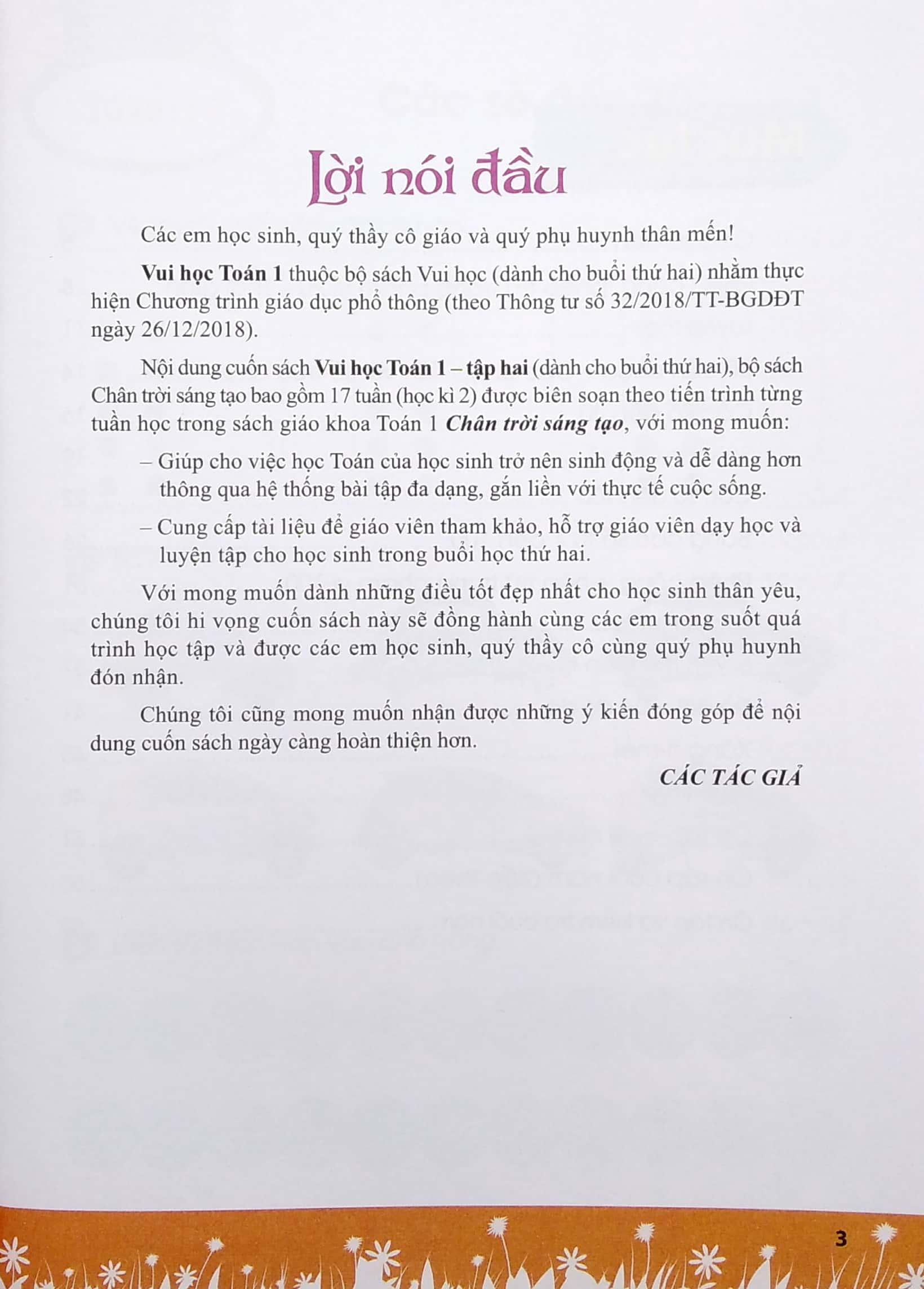 Nội dung cuốn sách Vui học Toán 1- tập hai (dành cho buổi thứ hai), bộ sách Chân trời sáng tạo bao gồm 17 tuần (học kì 2) được biên soạn theo tiến trình từng tuần học trong sách giáo khoa Toán 1 Chân trời sáng tạo, với mong muốn: