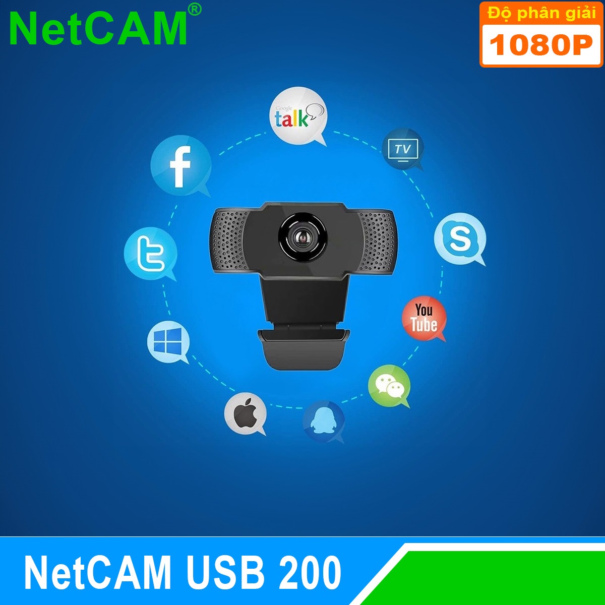 Webcam NetCAM USB 200 độ phân giải 1080P   Webcam NetCAM USB 200 được thiết kế nhỏ gọn, hiện đại với màu đen cá tính và thanh lịch, dễ sử dụng ở mọi vị trí.  Có chất lượng khung hình cao với độ phân giải 1080P cho phép người dùng giao tiếp video cực kỳ rõ nét, liền mạch thông qua Webcam NetCAM USB 200, tốc độ khung hình 30fps đảm bảo hình ảnh không rung nhòe trong chuyển động khi giao tiếp. Webcam NetCAM USB 200 1080P được trang bị kẹp phổ thông có thể đính kẹp trên màn hình laptop, LCD hay PC… hoặc sử dụng để bàn, kệ tủ để thực hiện việc truyền phát, giao tiếp hình ảnh cực tiện lợi.     Thiết kế nhỏ gọn Webcam NetCAM USB 200 1080P được thiết kế rất gọn nhẹ với chiều dài chỉ 2.95 inch, sang trọng với màu đen lịch lãm. Máy khá nhẹ với trọng lượng chưa đến 100 gram, dễ dàng bố trí và sử dụng trên máy tính, laptop hoặc các thiết bị phù hợp.     Tích hợp micro kép Webcam NetCAM USB 200 được hỗ trợ Micro kép tích hợp đa hướng, lọc âm, giảm tiếng ồn, giúp bạn giữ được giọng thoại trong trẻo, tạo cho bạn cảm giác thoải mái trò chuyện với đối tác, bạn bè, thầy trò bất cứ khi nào mình muốn.     Kéo gần khoảng cách Webcam NetCAM USB 200 giúp thu hẹp khoảng cách chúng ta từ XA lại còn GẦN, thuận tiện trong các việc: Work From Home, họp hành, giảng dạy, học nhóm, nói chuyện với người thân ở xa,...     Tương thích với nhiều hệ điều hành  Webcam NetCAM USB 200 tương thích với hệ điều hành iOS / Android, bạn có thể sử dụng trên các phần mềm thông dụng hiện nay như: Skype, Zoom, Google Hangouts, Face Time,.     Trải nghiệm ngay hôm nay với công nghệ mới của Webcam NetCAM USB 200, chắc chắn bạn sẽ hài lòng.   Thông số kỹ thuật - Độ phân giải 1080P - Chuẩn hình ảnh H.264, cho hình ảnh sắc nét và rõ ràng - Zoom: 0.5-1.2m. - Micro đa hướng tích hợp, khử tiếng ồn kép. -