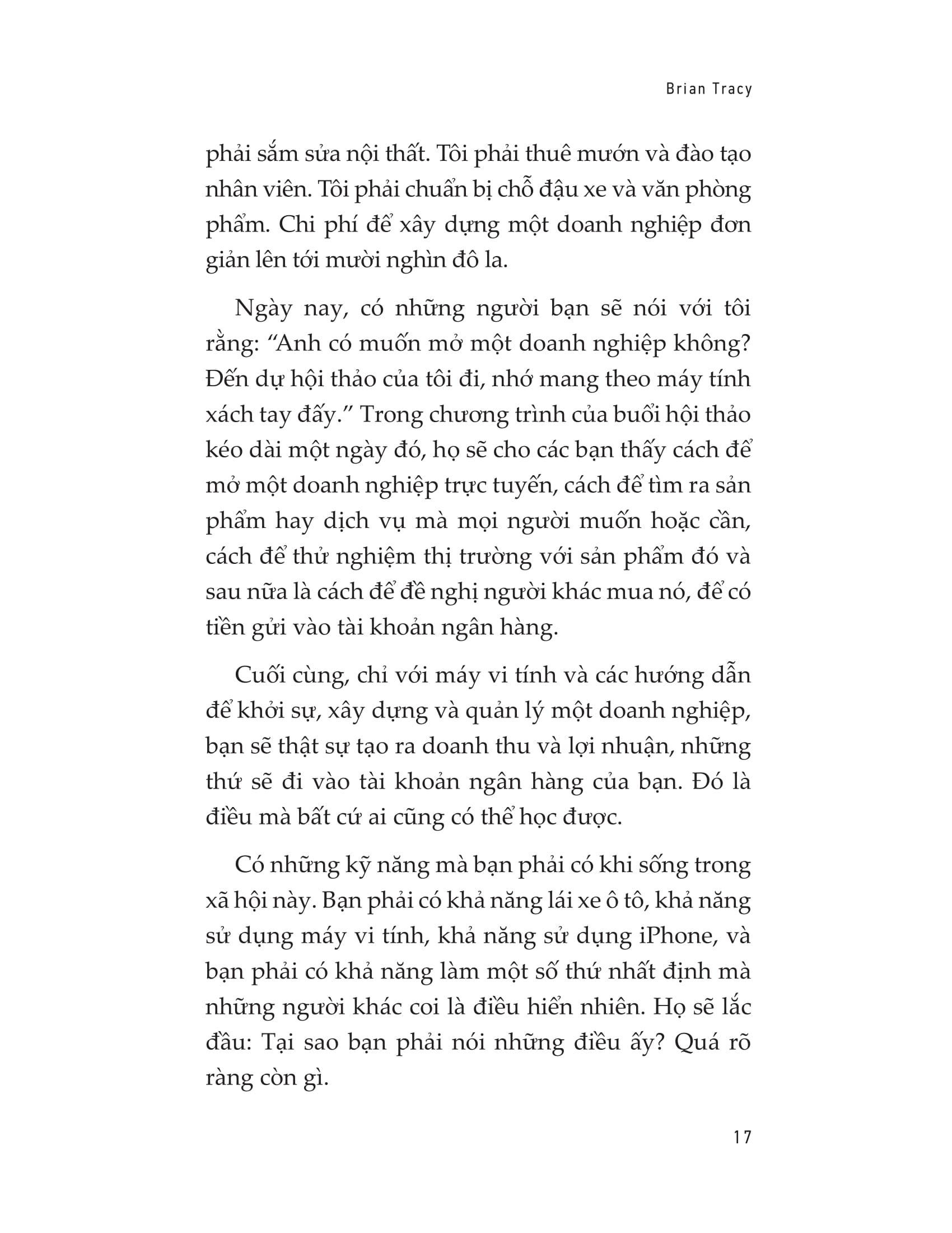 Có một kỹ năng bạn cần, cũng như kỹ năng đọc, viết và tính toán, đó là kỹ năng khởi nghiệp. Khởi nghiệp chính là nhìn vào thế giới xung quanh như một thế giới đầy các cơ hội để tạo nên sự thịnh vượng. Mọi thành công về tiền bạc trên đời này đều chính là tạo ra sự thịnh vượng. Là tăng thêm giá trị dưới một hình thức nào đó, là làm được việc gì đó. Việc của bạn là tìm ra công thức thành công. Bạn sẽ thử nghiệm bằng phương pháp thử và sai, bạn sẽ hỏi mọi người rất nhiều câu hỏi, bạn đọc và nghiên cứu, và bạn sẽ không ngừng trở nên giỏi hơn. Tất cả mọi công thức thành công đều có thể học được. Bạn có thể học được bất cứ thứ gì mình cần học.