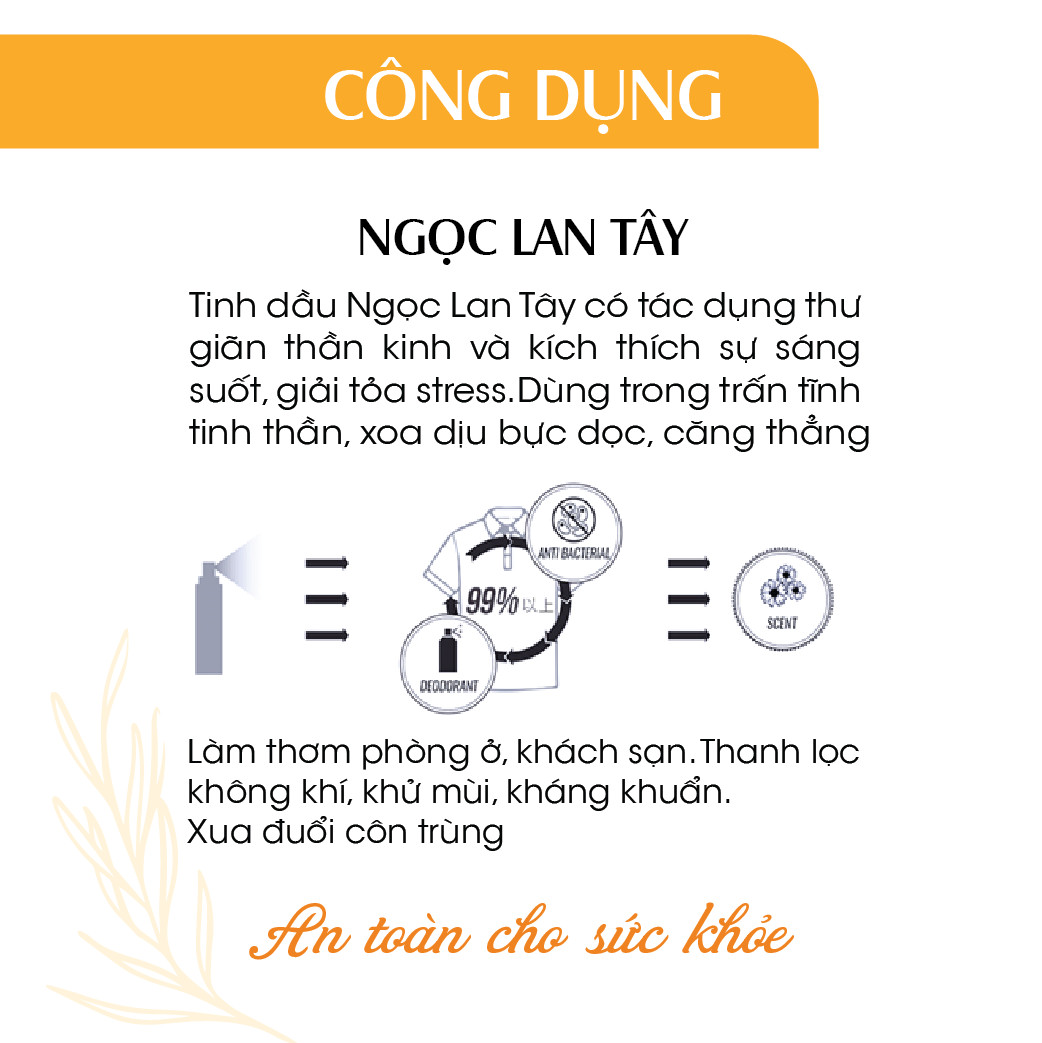 - Hiệu quả: Nốt hương chính Ngọc lan tây: Tăng cường năng lượng và hiệu suất làm việc, tăng sức đề kháng, giảm nhức đầu, khử mùi hôi, và xua đuổi côn trùng