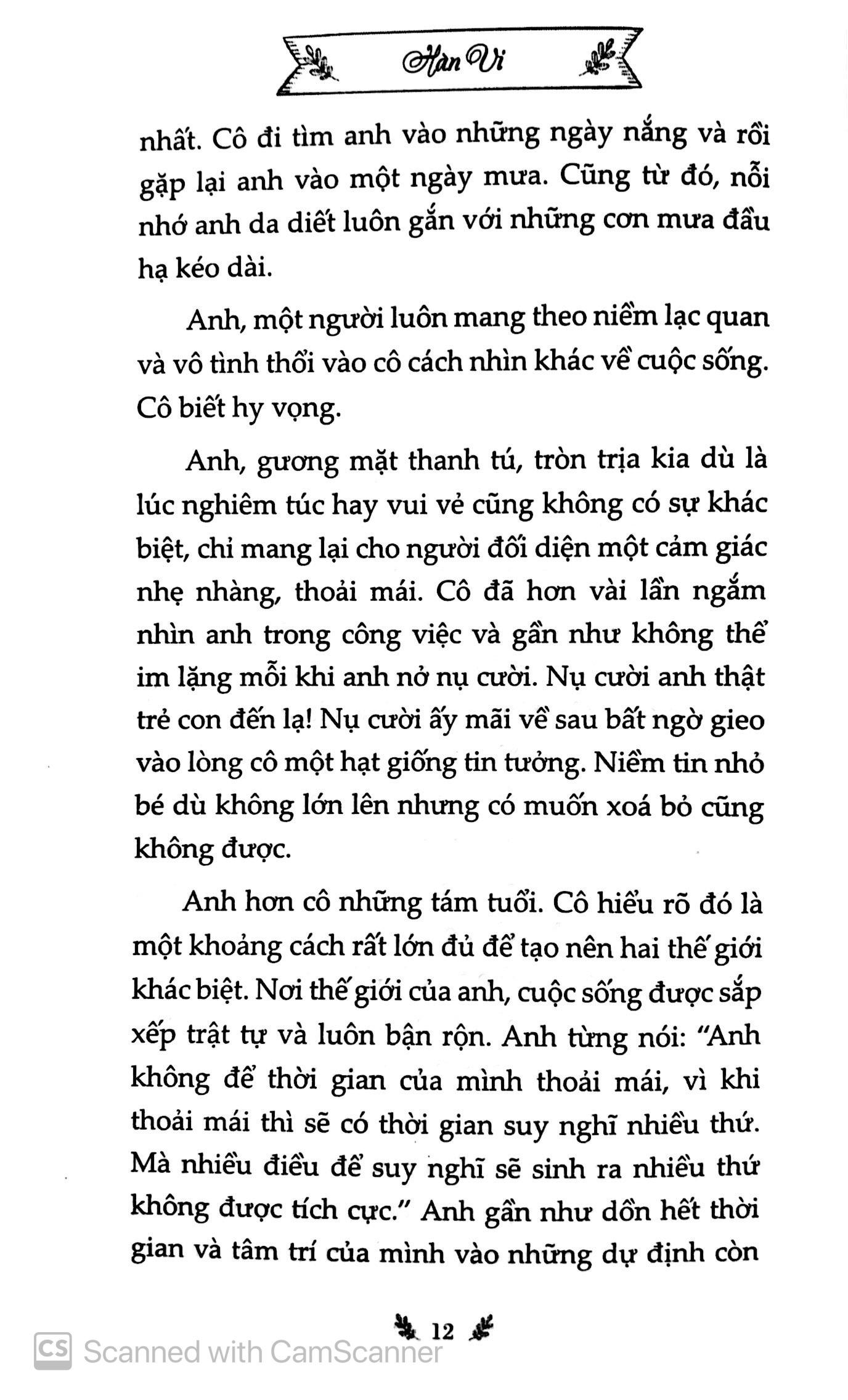 Tôi gặp Hàn Vi với một cái duyên kỳ lạ. Nàng ngỏ ý làm cùng tôi khâu kịch bản cho chương trình Radio Online "Sổ tay cảm xúc" mà tôi đang làm host. Đúng lúc đó tôi đang loay hoay với quá nhiều thứ cần dọn dẹp trong cuộc đời xoàng xĩnh của mình. Tôi "ô kê", chấp nhận để nàng cứu vớt đời mình. Sau đó nàng cho tôi xem truyện ngắn, giới thiệu này nọ nọ kia về chúng. Chúng tôi diễn đọc trên Radio Online nhẹ nhàng, cho đến khi nhiều người nhắn tin facebook cho tôi theo kiểu muốn truy cùng đuổi tận "Hàn Vi là ai?" để làm một việc vô cùng bức thiết và thô bạo đó là… add facebook! Tôi đã mời nàng vào cuốn sách này như thế đó!